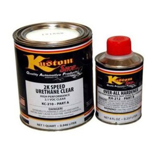 Kustom Shop 2k Speed Urethane Clear for Spot and Panel Repair Use. Kit Includes: 1 Quart of KC210 2K Urethane Speed Clear, 1 Half Pint of KH211 Spot Repair Hardener. Formulated for premium productivity at less than 2.1 VOC. Can be applied over a variety of base coats in base coat/clear coat systems. Two-component polyurethane system with a 4:1 ratio offers a durable, high gloss finish. Product is user-friendly, resulting in increased production.